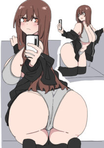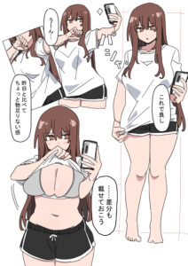最大の特徴は、その「視点」の徹底さにあります。物語は「自撮り」という形式を軸に展開します。つまり、読者は常にリナちゃんが意識する「鑑賞者」の立場に立たされるのです。彼女がカメラ(あなた)を見つめ、恥じらいながらも徐々に熱を帯び、自らの肉体を愛で、興奮していく…。この一連の流れは、単なる観察ではなく、能動的な「参加」へとあなたを誘います。特に、下着に包まれ、その膨らみと質感が克明に描かれる巨乳へのこだわりは圧巻。局部を直接描かないという制約が、かえって官能のベクトルを「見せること」と「見つめられること」の相互関係へと集中させ、独特の緊迫感と親密感を生み出しているのです。